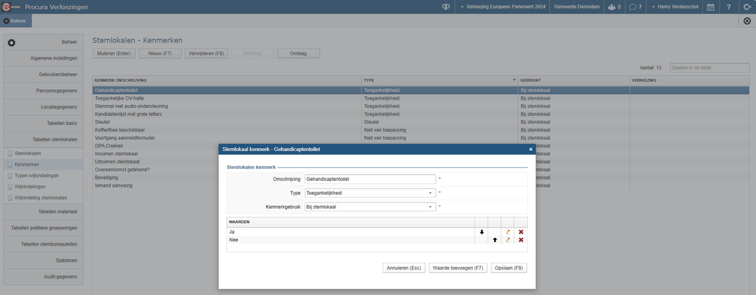 Voeg bij Beheer > Tabellen stemlokalen > Kenmerken deze gegevens toe met als type 'Toegankelijkheid' en als waarden 'Ja' en 'Nee'. Andere waarden zullen niet worden doorgegeven aan waarismijnstemlokaal.nl. Let op: gebruik voor het kenmerk de exacte omschrijving zoals hierboven vermeld!image.png 115.26 KBGeef nu voor ieder stemlokaal wat tijdens de komende verkiezingen wordt ingezet bij de tab 'Kenmerken' aan of deze faciliteiten op dat stemlokaal aanwezig zijn.{E62E8E0E-C9A7-44B1-A245-C54906EE0EFA}.png 167.92 KBHerhaal dit voor alle relevante stemlokalen. De wijzigingen zullen nu automatisch worden doorgegeven en na enige tijd zichtbaar zijn op waarismijnstemlokaal.nl